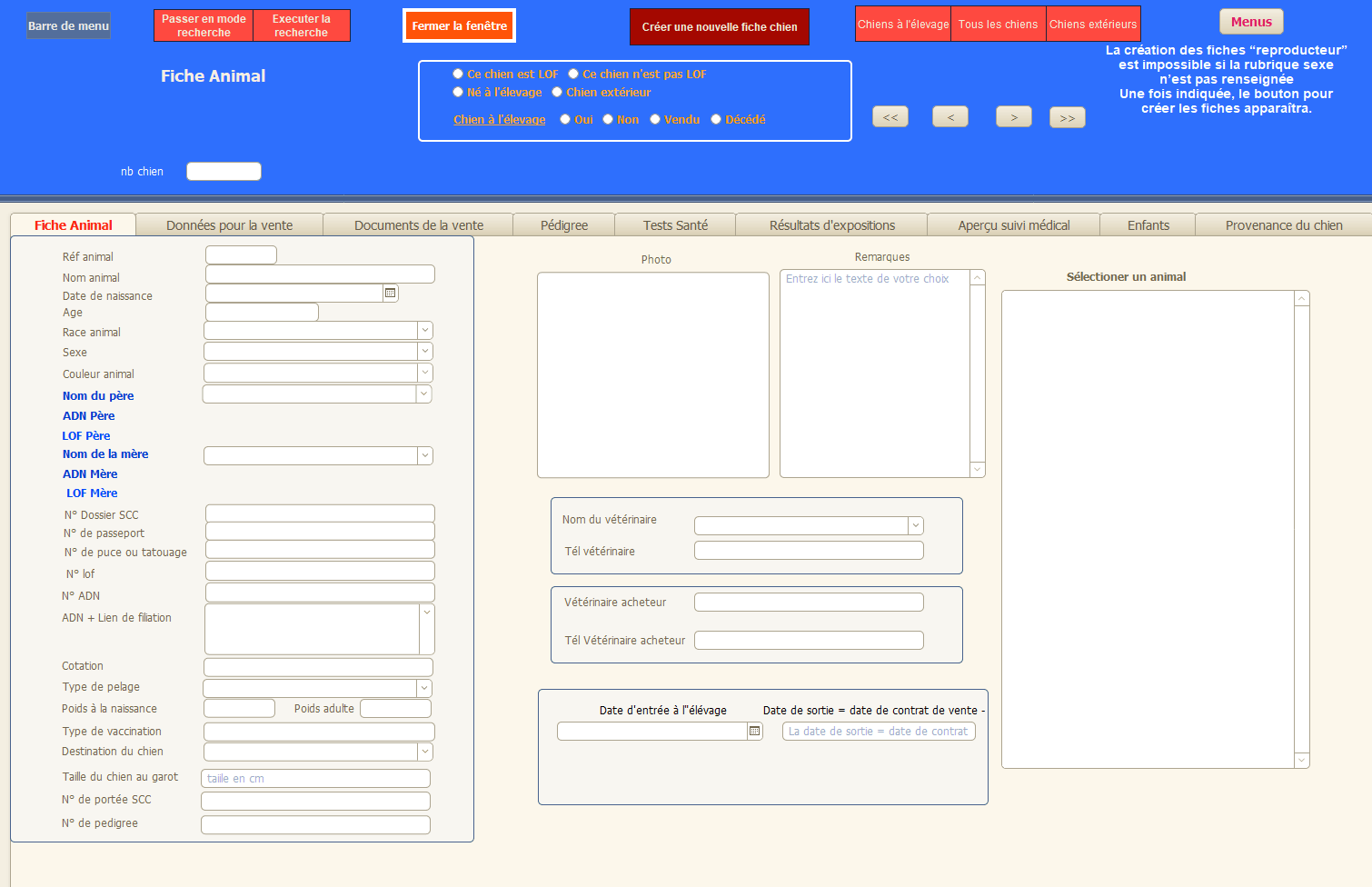 Toutes les informations sur le chien à l'aide des 9 onglets :